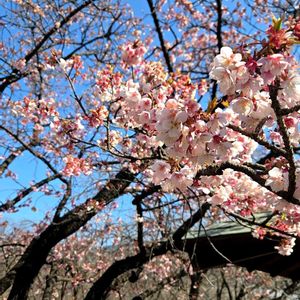 カンザクラ(寒桜)バラ科サクラ属 昨年は2月末に満開でした。 今年は二週間遅れですね。 5⃣ 白い建物の上に富士山が見えます。 カンヒザクラとハヤザキオオシマの交雑種です。 お花は1〜3月に咲き、淡紅色で、横向きに咲くそうです。 🏷 土曜はお空の発表会 🏷 おしゃれな土曜日♪