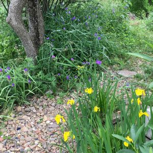 裏庭の入り口にある柿の木の下に、 ダッチアイリスとムラサキツユクサ。