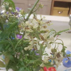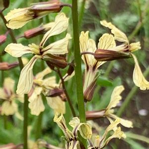 ルッコラ(ロケット)です。 イタリア料理で馴染みがあります。花色は白色ないしクリーム色です。 英語名から別名でロケットと呼ばれます。 和名:キバナスズシロ(黄花蘿蔔) 別名:ルッコラ