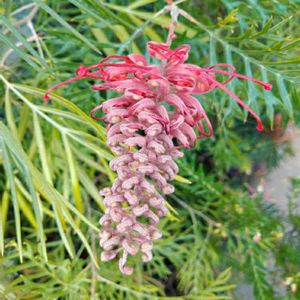 《グレビレア ラニゲア》 葉っぱは『ローズマリー』のような肉質な葉です。 お花も個性的でくるりんくるっ♪ かたつむり🐌みたいな形にもみえる⁉️ ( ゚∀゚)アハハ八八ノヽノヽノヽ