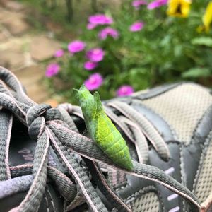 ゲゲゲ‼️ ベランダに置いてある運動靴の紐に、何故かサナギが⁉️ もう動き回ることも無いので、このまま様子見しています😅
