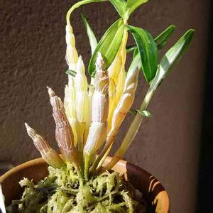 セッコクの紅小町です😊 飴矢がとても綺麗です🎵 若い時は赤く、大きくなると鼈甲飴みたいな色になるようです😆 少し透けてるところが良いですね😉