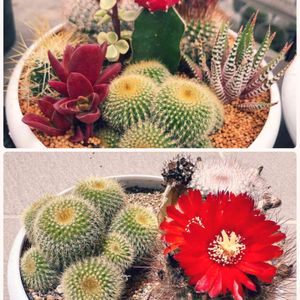 去年買ったサボテン&多肉の寄せ植えのビフォーアフター。。。ひぃ〜っ悲惨😭😭😭 購入当時全く知識がなく、日が当たらない室内で必要以上に水を与えるという最悪なことをした結果、見事に枯れまくり腐りまくり…💦💦特に火祭りは真っ黒になって小蝿が発生して大惨事でした😱 かろうじて形は残ってるサボテンももうダメかなーと諦めていましたが、今日花が咲いたのでまだ生きてる…?🤔
