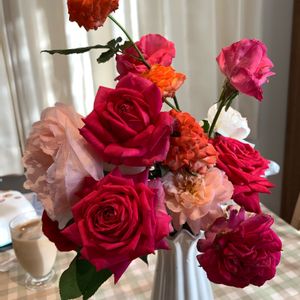 台風が週末やってくるとのことなので、今咲いているバラさんたちを切り花にしてみました。レジスマルコンさん、今年の夏に鉢増ししたせいか、めっちゃ咲いてました。一部、細い枝にも咲いて、重みで枝先を垂らしてシュラブ樹形のように咲いてました。その花は少しピンク色によっていたので、もしや枝変わりしちゃったのかな??