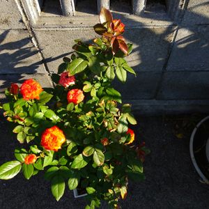 バラのカリスマさん。 非常に激しい雨風の台風でしたが 軒下に避難していたおかげで綺麗に咲いてくれています。 木立性ですが樹高も50cmぐらいでコンパクトでトゲも少なく8号鉢に綺麗に収まって、どんどん鮮やかなオレンジと赤のお花をつけ始めました。 そして花持ちが非常に良い。咲いたばかりはオレンジですが、時間が経つとボイルしたカニの赤色のような明るい赤色になり、そこからだんだん色が抜けて白っぽく退色する感じです。花びらも丈夫なのでバラバラと花びらが散らないので掃除も困らないです。ある程度退色して花を摘んであげるとどんどん蕾をつけます。 銅色の新芽も美しいですね!