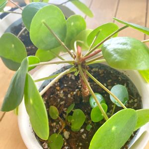 昨年いただいてから育てかたが確立できずとても苦戦したペペロミオイデス。 出てくる葉っぱが全部丸まってしまい酷い姿になっていました。 1年程かけて可愛いパンケーキの葉っぱが生え揃い、小さな子株ちゃん達が出てきました♡ 置き場は朝だけ日が当たるバルコニー。 お水はだいぶカラカラに乾いてからたっぷりと。 これがわからなくて、ウンベラータや他の植物と同じペースで与えていた時は全然ダメでした😅 とても根腐れしやすいようです。 その時は根っこもスカスカでした。 丸い葉が生え揃った今でも下の方から葉っぱが落ちてしまいます。 もっと上手く育てるにはどうしたら良いのかな。