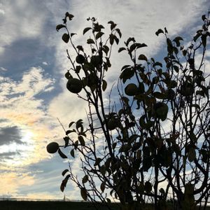 逆光で見えにくいけど、道沿いにたくさん大きな実がなってる。 果樹を街路樹にするって珍しいよね。