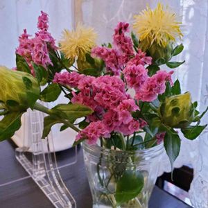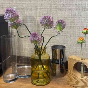 丹頂アリウムも短くして、 違う花瓶に入れて雰囲気チェンジ🙌🏻 黄色の花瓶に紫が映える🤗 もう満開で水変えるたび種?が落ちます。 もう少しでさようならの予感が😭 最後まで頑張って、水変え頑張る💪w 横は一輪挿しの花瓶に紅花をちょこっと。