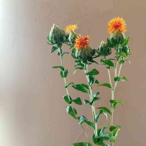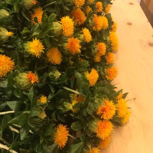 紅花☆ 紅花って和風なお花かと思ったけど、アーティチョークやオージープランツの様に個性派な外見です。凄くタイプ♡ オレンジ色の可愛いドライフラワーになるので2度嬉しいです♪しかも1本でこの本数、しかもめちゃ安い‼︎満点なお花です。