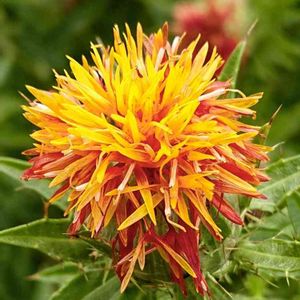 紅花(ベニバナ) キク科ベニバナ属の多年草。エジプト原産とされる。古代から染料に用いられ、食用油や薬用として世界中で栽培されている。全体無毛、茎は直立してよく分岐し、高さ1mほどになる。葉はやや硬い質で先の尖った卵形。花期は5~6月、茎の頂に紅黄色の筒状花をつける。アザミに似た花は黄から橙色に変化する。外側の総苞片は葉状。痩果は長さ8㎜ほどで冠毛を欠く。古代に薬用、染料として渡来した。山形県などで栽培されるが、ときに逸出、野生化する。 出典『日本帰化植物写真図鑑』