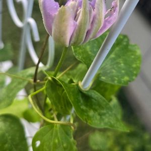 クレマチス ベル🔔さん🧚♀️🧚♂️🧚 名前が 長いから ベルさんと呼ぶ🔔この子💜🤍💜 一度 ツルが長くなりすぎて 行き場がなくなり なんだかんだで 枯れてしまい💔 しかし 2センチくらいに短く剪定していたら またまた🌿復活して なーんと一輪 咲いてくれたでは ありませんか😍😭 私 あなたが まさか 咲いてくれるなんて 夢にも思わなかったから ちょっと感激すぎるよ🥲 最近 涙腺が 早くも弱いのでした〜😅