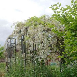 2020.4.21 庭の藤の花 去年ばっさりの剪定したのが良かったのか 葉っぱと花が適度につきました。 甘い香りに誘われて クマンバチ🐝がブンブン来てます。 這わせてるモノは、使わなくなった 古い洗濯干しスタンド こちらも一昨年台風で倒れて、 スタンド向きを南北から西東に変えて2年 その後は倒れていません。 根元は、40cmほど掘りトタンを丸くして 根が広がらないように工夫してます。