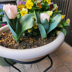 ①チューリップ🌷 3月16日:咲いた😆💕っと思ったら ずんぐりむっくり色も白っぽい?(・_・;アレレ??ピンク色だと思っていたのに💦 でも今朝見たら、ピンク色😍💖 すごく綺麗で背も伸びましたよ☺️✨ ✳️品種名調べてみたら、 「フォックストロント」という子でした🌷 咲き始めは淡い色で、段々ピンク色になってくるタイプで、偶然の出会いでしたが迎えて正解でした😊💕 ②今朝はまさかの雪でビックリしました❗そんな中でもビオラは元気です😊💕
