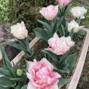 おはようございます 黄砂の影響か見通し悪い朝です。 気温も高く散歩してて暑いくらいでした。 我が家の球根たちも次々に咲いてきました♪ チューリップ 八重咲きフォックストロント 咲き始めは白くだんだんピンク色になってきました〜🥰
