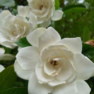 クチナシ🎵 青虫に 葉を食べられてましたが。🌱 新芽たくさんモリモリで 2輪 純白の花咲かしてくれました。🙌🎶