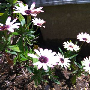 ①オステオの寄せ植え。 2年目のオステオスペルマムが株も大きくなっていたので盛大に開花してきました。 中心部が紫色🤭 頑張れサンセットシェード! ②挿し穂からのマーガレット2種。 小さいながらもたくさんの蕾をつけてます🥰 ③④目覚めから勢いが出てきました。 ライムジンガーは上から見ると目玉のようでちょっと気持ち悪いです😅笑