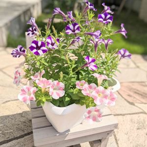 挿し芽でミニミニプランターに植えていたお花が大きくなってきました🌱✨✨ 💜あふれ咲きペチュニア 💗サフィニアももいろハート 成長するまで何が咲くのか分からなかったのですが かわいい組み合わせになりました☺️
