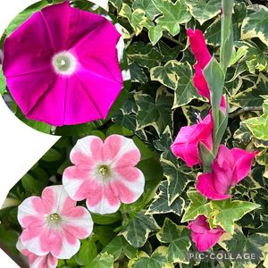サフィニアアート ももいろハート💓 あずきフラッペ🫘 ペチュニアアモーレ クイーンオブハート♥️ 結構大きく育ちました😃