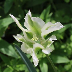 星形の花びらに 淡くグリーンが入っている 白色の「チューリップ」 ようやく一本開花宣言です!