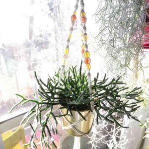 新しい仲間リプサリス用に新しいプラントハンガーを編んだ。 タコ糸+オレンジのビーズ+金色のミニバケツ(IKEA)