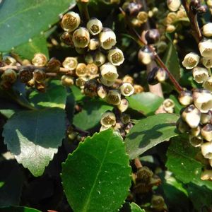 おはようございます😃 近づいて見ないと見えない小さな花です。 ヒサカキです。 神事にサカキの代用として使われます。 スーパーなどでサカキとして売られているのはこのヒサカキのことが多いです。😅 サカキよりも小さな葉っぱです。 その細枝にびっしりと米粒のような花が咲いています。 サカキはエゴノキのように花柄のある白い花がぶら下がりますが、こちらは柄がなく、直に枝にくっついています。 花はよく見ると可愛らしいです。😊 しかし、これが実になるとアブラムシがびっしり付いているように見えて、触るのも気持ちが悪いようです。😅