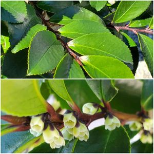 今日投稿の名前を教えて! 下向きに咲くヒメシャラ・・ヒサカキ・・ 検索🔎していて サカキかも⁉️ 合ってますか? 👀🔎picの拡大比率は いい加減です😅 左・今日 📖サカキ🏵️ ツバキ科サカキ属 葉 緑が濃く縁は滑らかな曲線 花 6月頃小さな白い花が咲く 右・3/15撮 📖ヒサカキ🏵️ ツバキ科ヒサカキ属 葉 長楕円形で先端尖る 縁は細かいギザギザ サカキより一回り小さい 花 3~4月頃直径5㎜程のクリーム色の花が下向きに咲く