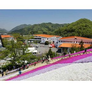 『ヤマサ蒲鉾夢前工場の芝桜』 〜つづら折りの芝桜の小路〜 魚を扱う蒲鉾工場なのに、工場は姫路市の北部山沿いにあります。訳は、水と空気がきれいから。 工場敷地周囲の山裾に18〜20万株を植栽し、なんと毎年駐車場無料・入場料無料で開放しています。 県外からもツアーバスが訪れます。 お土産は、工場直売所のできたての蒲鉾てんぷらや竹輪をどうぞ。