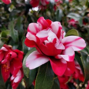 おはようございます😃 珍しい椿です。 孔雀椿です。 細い花びらが下向きに垂れて咲きます。 赤に白い斑が美しいです。😊 枝も枝垂れています。 細い葉っぱも椿らしくありません。 愛知県三河地方の西尾市で生まれた椿だそうです。 しかし、私は刈谷市で2ヶ所しか見たことがありません。 もっと人気が出ても良さそうな椿です。🤔