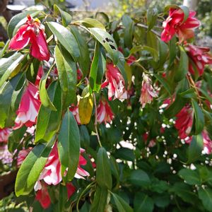 孔雀椿、今年もたくさん花をつけました❣️ 枝垂れ椿とも呼ばれて、います。伸長する枝は横向き又は斜め下方向に枝垂れ、ているので晴れた日には散歩をしている人から下を向いているので「元気ないですね。水をやらないと。」と言われたことがありました😅
