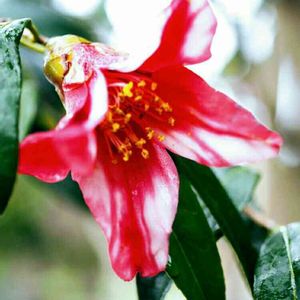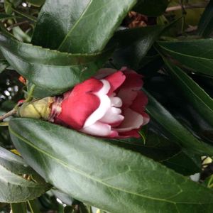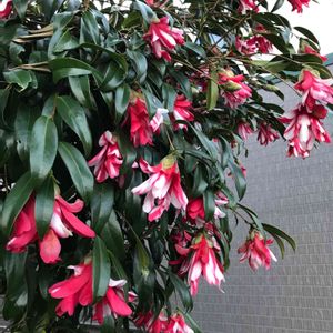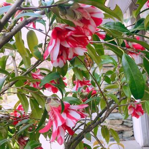 ぶら下がるような花のつき方をする孔雀椿。 真っ赤に咲いているのが多いですが、たまにマダラな色合いのも。