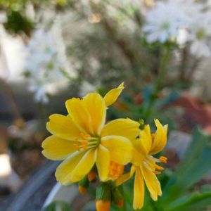 おはようございます☀️ きれいな青空の朝です 黄色のレウイシアやっと咲きました。バックは、白いレウイシアです。