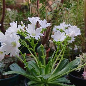 ■純白のレウイシア ・Lewisia cotyledon/レウイシア ・スベリヒユ科レウィシア属 常緑多年草 ・北米原産(米国オレゴン州~カリフォルニア州) ブラックテール(アゴニス)、セルリアと並んで、毎夏枯らしてはまたお迎えを繰り返している三大難物のレウイシア。アゴニス、セルリアと同様、蒸し暑い大阪の夏は苦手なようです。GSで「数年育ててここまで大きくなりました」picを拝見したことがあるんですが、涼しい地域の方だったような。大阪でも夏越しできるんですかね。暑い地域お住まいの方で「夏越ししてますよ」という方がおられましたら、コツなどご教示くださいませ🙇♂️ 最高気温16℃、最低気温6℃ (以下、みんなの趣味の園芸HPより) ・特徴 レウイシア・コチレドンは多肉植物のように見える草姿から、造花のような華やかな花を咲かせる多年草です。自生するものは、主に、北アメリカのロッキー山脈北西部からカリフォルニアにかけての山地の岩場などに多く見られます。鉢花などで流通することもありますが、実際は暖地では栽培の難しい高山植物で、流通する鉢花なども寒冷地や山地で栽培されているものがほとんどです。 レウイシアの仲間には、常緑性のものと、夏に葉が落ちる夏眠性のものがあり、レウイシア・コチレドンは常緑性です。堅く肉厚の多肉植物のような葉をロゼット状に広げて、春に葉のつけ根に花芽をつけます。花芽は次第に伸び、細い茎に桃紫色のかわいい花を数輪咲かせます。育てていると地下茎は太くなり、立ち上がって茎のように木質化します。近年では園芸化が進み、さまざまな配色の花色をもつものや、重弁のものなども見られます。 ・栽培環境 日当たりを好むので、基本的には風通しのよい明るい棚上で管理します。ただし、暑さを嫌うので、夏の間のみ30~50%の遮光下とします。冬は、寒風が吹く場所では芽が乾いたり、葉が脱水して枯れたりするので、風よけの下かハウスやフレームなどに取り込みます。 ・水やり 多湿を嫌います。雨が長く降る時期は水やりを控え、乾かし気味に管理します。特に、夏にロゼットの中心に水がたまると傷みやすいので注意してください。通常は、乾きやすい棚上では1日1回たっぷりと水を与えればよいでしょう。