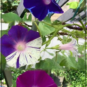 『今日のお花』① 🍀💙アサガオ💙🍀 早朝ウォーキング🚶してる頃に撮ったものです。 右下はまだ日が昇る前の5:17に撮影