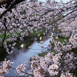 夕暮れ時の川と桜 「ソメイヨシノ」🌸🌸🌸🌸 灯りが川面に写り綺麗です✨ 🔦 🌃🌙*゚この時間になり昼間よりやはり冷えて… 予報通り☔️降り始めて来ました ☂︎*̣̩⋆̩* 今日もお疲れ様でした♡♡
