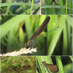 たくさんの黒い 「イトトンボ」がヨシの緑の葉にとまってる 羽根が黒だから「ハグロトンボ」かな⁈