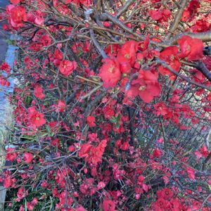 今日のお花 ✿ 「木瓜」 ♥️ いつも歩く🚶川沿い遊歩道に反対岸からも目に付くほど赤♥️が鮮やかで…冬から春にかけて毎年何株か素敵にさいています✿ 時々やってくるメジロ🐦が居たらもっと絵になります😊