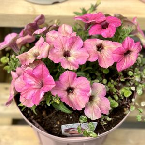 ペチュニア・ティー ◻︎フラミンゴ🦩 パンビオ、ウインティーを片付けたらスペースが開いて寂しくなったので 園芸店に行ってきました🌺 午前中は晴れていてお花屋さん日和☀️ 《雨にも強い》に惹かれて購入した ペチュニア・ティー フラミンゴ 大好きなニュアンスカラー🩷 7号鉢に植えました🪴