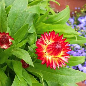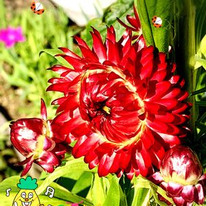 紅いムギワラギクが咲きました🌸 陽光☀️を浴びると、花弁が金属的な光沢✨を見せてくれて気分も ( ᐛ ) ♬✧ルンルン