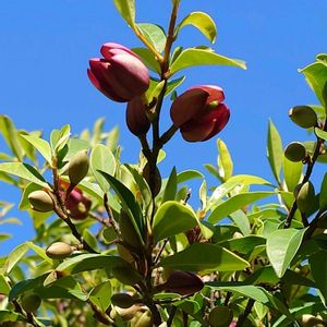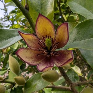 カラタネ オガタマの木 《唐種招霊》 品種《ポ-トワイン》の花 ワインカラーに半開きの花 神社の境内に植栽されることが多い御神木? バラやボタン、シランの 開花状態を確認の為 庭に出ると、いきなりバナナのような甘い香りが漂ってきた?🤔 ふと庭の奥にそびえる木を見上げると無数の赤ワイン色の 花が鈴なり🧐😮😍 匂いの正体発見✴️🥹