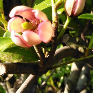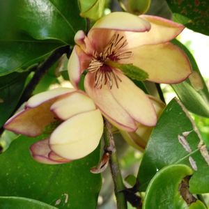 モクレン科 モクレン属 中国南東部 原産 常緑小高木 樹高2~5m 日向から半日向 湿り気のある肥沃な土壌を好む 江戸期に渡来したとされ 日本のオガタマノキ同様 縁起木として神社に植樹された 漢名 含笑花 花言葉 甘い誘惑 バナナの香りのする木 として知られています。 以前はオガマタノキ属として 分類されていました。 ひとつの花は短命で1日程度 たくさんの花を咲かせ 10数日は香りが楽しめます。 オガタマ-神を招くこと 本日のお花 モクレン こちらではすでに終わり 常緑のモクレン科の花が 咲いています。