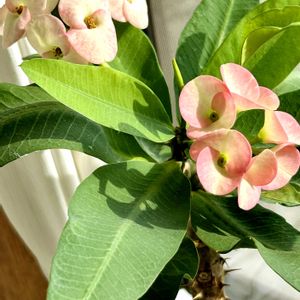 窓辺のハナキリン 八福神は季節によって、咲き進みかたによつて、花の色が変わり、今年は根元や幹に沢山枝が生え、子孫繁栄です🤗根元の子にも花が咲き、2本は外して嫁入りしました😉🌿💕🌿