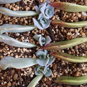 ホワイトクイーンの葉挿したち🌱 春先にばらばら事件が起きて、 やばい!とにかく葉挿ししよう!!!と 全部挿したら全部付きましたΣ(・ω・ノ)ノ 葉挿しは得意な方じゃないのですが、 この子は100%成功してます✨ ばらばら事件といえば…、 ここ数日で外の多肉たちがいくつもお星様になりました。 暑さと湿度のせいかな…、 水は夜に数日に一度チョロ水だけなんだけどな…。 サブセシリス錦には泣きました…。゚(゚´Д`゚)゚。 お高い子とお気に入りの子はつらい😭 家の中じゃ日照不足になるしなぁ。 いろいろと試行錯誤してますん。