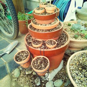 庭の隅で、枯れたままの植物や雑草が入っていた素焼き鉢を整理して、タワーを作りました。 いろいろ考えながらする、こんな作業が大好きなので、あっと言う間に夕方になってしまいました。 (^o^;) さぁ、なに植えよう!? 多分またセダムだけど(笑)! (^3^)/