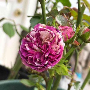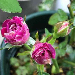挿し木シリーズ セインティッドジュエル やっとダークパープルに近づいてきたかな😅 強香 ダークパープルの絞り模様 小さな花のスプレーバラだけど 存在感はありますね✨