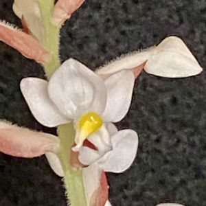 Ludisia discolor 原種の地性ラン ① 花;1.8x1.5cm ロアーセパルの形が変わってい ます。 ② 穂状に花を10数輪付けます。 ③ 丈;35cm ④ 葉脈が浮き出して模様が綺麗な ことで、ジュエルオーキッド (宝石ラン)とも呼ばれるようで す。