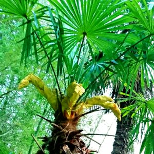 ヤシ(シュロ)にお花が咲いていました😳 ふくろみたいなモノから、このお花が出てきたみたいです 面白い形をしています