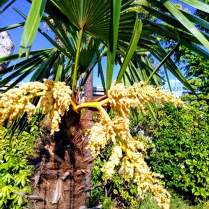 以前の写真です 朝の散歩道🚶♀️ご近所散歩🚶♂️ 通り道のお宅のお庭に、 シュロのお花が見えました。