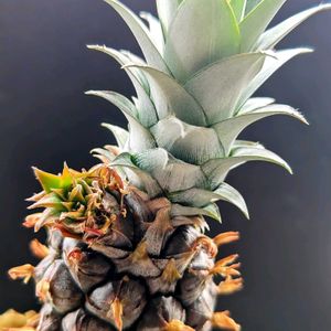 おはようございます😊 昨日のパイナップル🍍の様子です。 昨日、画像を園芸の先生に見ていただいて、花芽だと確認。パイナップル🍍は集合花。約150個の花が螺旋状に密集して付いてるそうです。花は下から順に咲き、花の色は紫色とのこと。 これから花芽が伸びてきて、花を咲かせ、実🍍になる。切り過ぎた葉っぱ😅無事栄養を花に届ける事ができるのか⁉️ まだまだ先は長い•••。2枚めは検索した花芽画像との比較。フフッ🤭花芽だぁ💕 昨日の大谷選手、10号ホームラン🎉。連戦お疲れ様。今日も頑張れ〜📣。 (2025/5/7撮影)