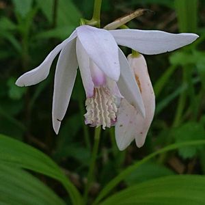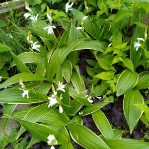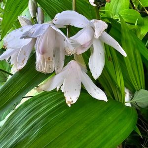 シラン。 白花は葉にも斑が入り涼やかに感じます。 毎年、少しづつ増えて欲しい方におすそ分けしてます。