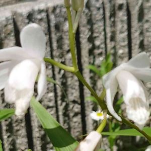 🌸シロバナシラン🌸 シランの白い花です! 我が家では日陰にあるので 日向のシランよりもかなり遅れて開花してきます! 花は切らなくても 上にスっと引っ張れば抜けますよ。 花瓶にさすといいですね٩( ᐛ )۶